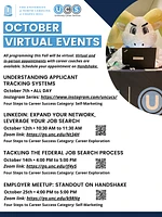 Check out our October Virtual Workshops and Virtual Fairs are offering in October and November. Fairs hosted by University Career Services are not open to students enrolled in the MBA, Law, Dental, and Medical programs. Share these opportunities with your students!